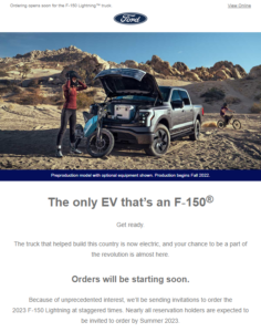 Uncategorized Email just received from Ford: “What’s next for your F-150 Lightning Reservation – Orders will be starting soon” administrator Posted onOct 10, 2022 at 4:07 PM 0 Comments … Read more…